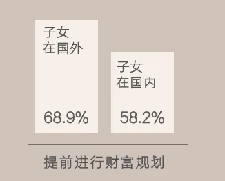 从不同家庭结构来看,子女不在身边的,在养老财富规划上有更强的紧迫感。有68.9%子女在国外的中高净值人群会提前进行财富规划,这一比例远高于子女在身边的家庭。子女在国内,离得近了,心理和资金上多多少少都有份安全感;子女在国外,“远水救不了近火”,紧急情况下即使子女有充足的孝心和经济能力,跨国汇款和沟通也存在很多不便。因此,中高净值人群只能靠自己提前做好财富规划来缓解地理分离所带来的养老焦虑。