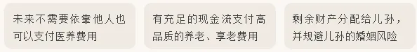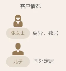 张女士与身边的亲属关系都比较一般。对于未来的规划,她的想法很明确:首先保证自己的养老不差钱,她希望住最好的养老社区,享受最好的医养条件,生活品质一点儿不能将就;如果还有剩余财产,再考虑传给儿孙。