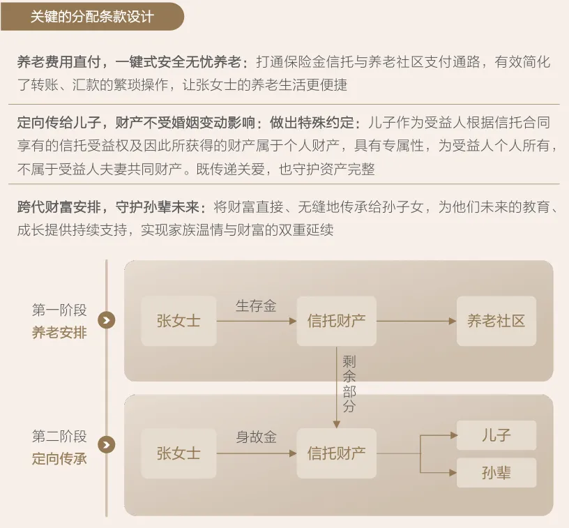 张女士今年70岁,是一名企业主,离异多年,独生子在国外定居,很少回国。张女士之前一直独居在家,近两年健康状况不是很好,已经入住养老机构,因为担心未来意识不清、无人帮助支付养老机构费用,希望通过信托帮助解决支付问题。