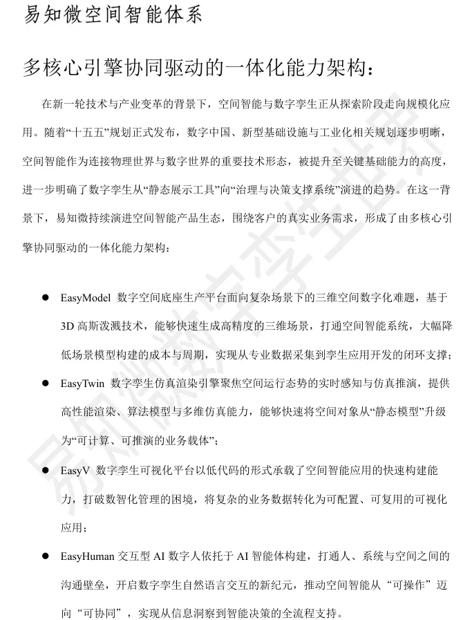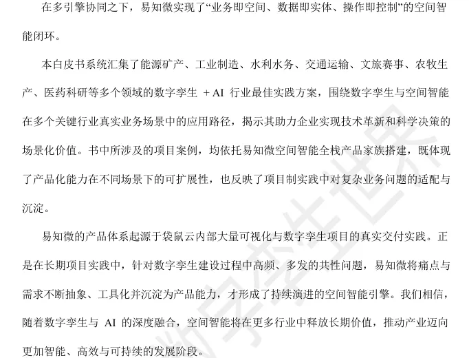 摘要:易知微依托EasyModel、EasyTwin等全栈产品体系,融合3D高斯、AI数字人等前沿技术,覆盖能源矿产、工业制造、水利水务、交通运输、文旅农牧、医药科研等多领域,服务3800+企业客户。汇集国家电网、宁波舟山港、长江流域防洪等典型案例,提供智能监测、仿真推演、风险预警、协同决策等一体化解决方案,助力企业打破信息壁垒、降本增效,推动数字化转型从 “静态展示” 迈向 “智能决策”,是行业数字化升级的核心参考指南。
