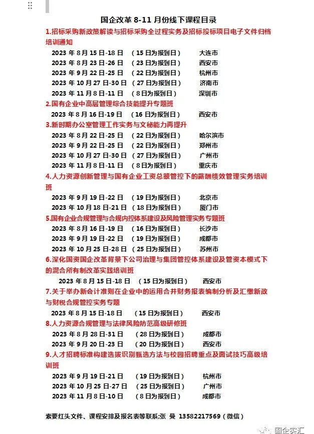 为深入贯彻党的二十大精神,落实党中央、国务院关于加快建设全国统一大市场部署,进一步破除招标投标领域影响各类所有制企业公平竞争、共同发展的规则障碍和隐性壁垒,优化招标投标营商环境,持续提振企业信心,激发经营主体活力,2023年7月17日国家发展改革委办公厅等十一部委联合发布了《关于开展工程建设招标投标领域突出问题专项治理的通知》发改办法规[2023] 567号。之前发布了《关于严格执行招标投标法规制度进一步规范招标投标主体行为的若干意见》;针对招标投标市场存在的招标人主体责任落实不到位,规避招标、虚假招标。围标串标、所有制歧视、地方项目保护等突出问题。国家发展改革委等部委将启动招标投标领域重点问题专项整治工作,进一步夯实各方主体责任,强化意识,确保招标投标法规制度得以严格执行,推动招标投标市场规范有序发展。 为帮助招标采购从业人员及时了解招标采购最新政策法规,解决在招标采购全过程中的问题,中国投资协会培训中心与北京中会联信息咨询中心定于9月、10月和11月分别在杭州市、济南市和深圳市举办“新形势下招标采购新政策解读与招标采购全过程实务及招标投标项目电子文件归档”培训班,希望各单位积极组织相关人员参加,相关事宜通知如下:各招标采购行政主管部门、国资委管理部门、各公管办、行政服务中心。公共资源交易中心,政府采购中心等相关人员;各单位从事招标采购、基建工程、纪检监察、财务、审计、合同、法务等部门相关人员;招标代理机构相关人员。2023年9月20日-23日 ( 20日为报到日) 地点:杭州市