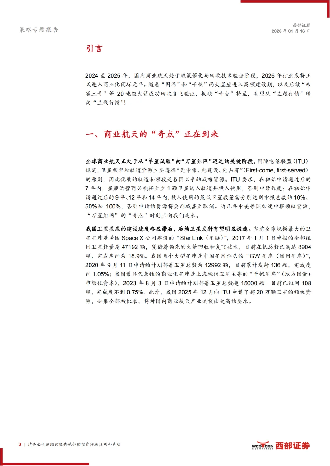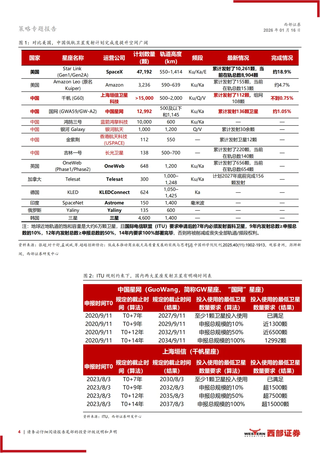 全球商业航天正处于从“单星试验”向“万星组网”迈进的关键阶段。国际电信联盟(ITU)对于卫星轨道和频段资源的申请使用有着严格的时间表,而当前我国两大星座卫星部署数量的完成度仅约1%。未来几年我国将逐步掌握火箭回收+多次复飞技术,国内商业卫星发射有望迎来高速增长。