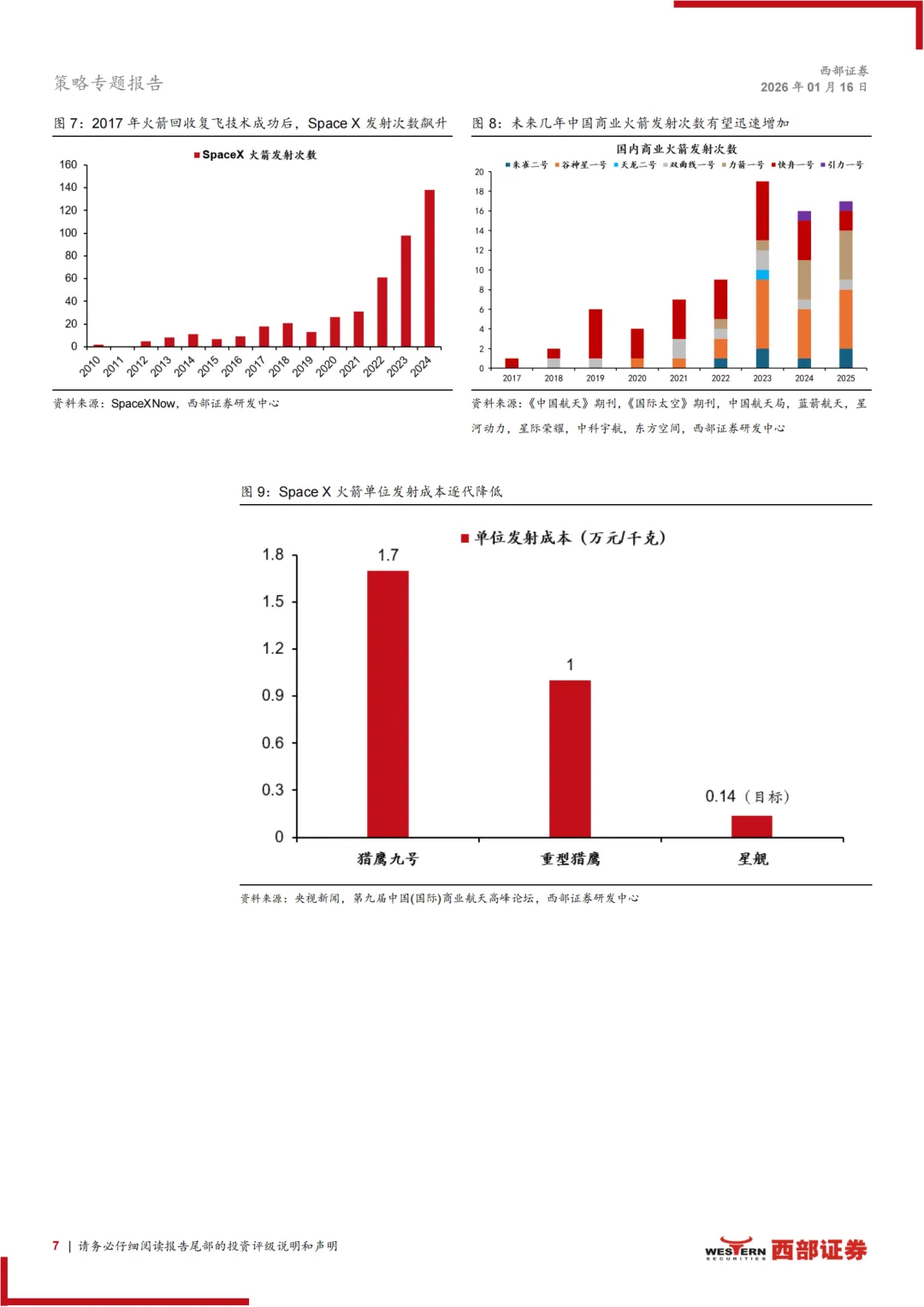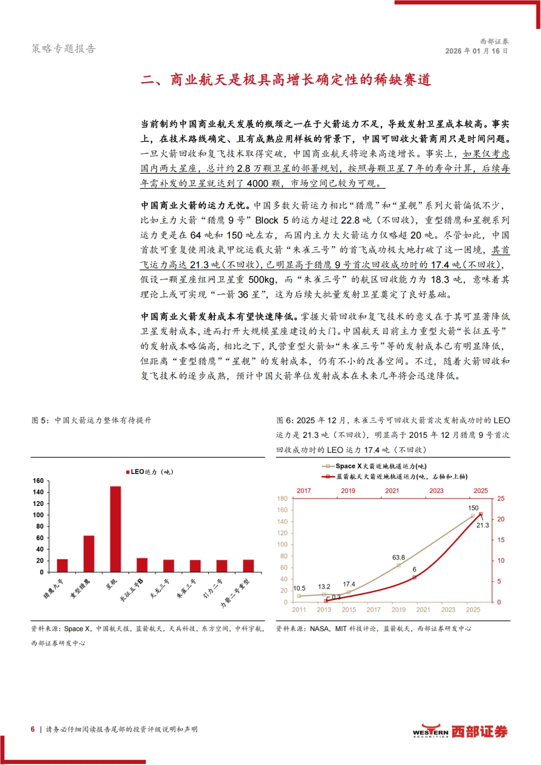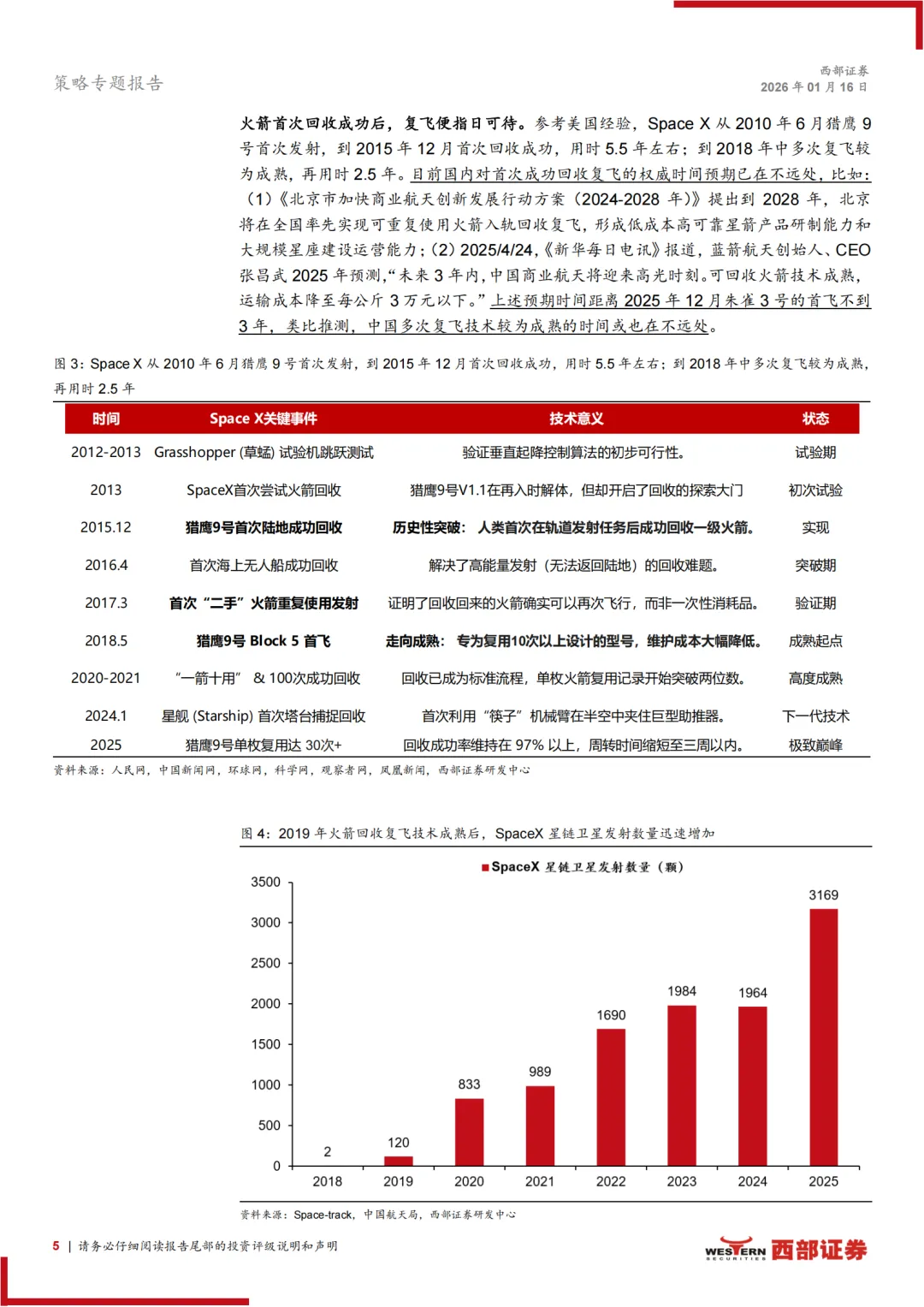 在技术路线确定、且有成熟应用样板的背景下,中国可回收火箭商用只是时间问题:( 1)商业火箭的运力无忧,“朱雀三号”首飞运力高达21.3吨(不回收),已明显高于猎鹰9号首次回收成功时的17.4吨(不回收),这为后续大批量发射卫星奠定了良好基础;( 2)中国商业火箭发射成本有望快速降低,相比中国航天“长征五号”的发射成本,民营重型火箭如“朱雀三号”等的发射成本已明显降低,随着回收复飞技术突破,未来成本将会继续下降。一旦火箭回收和复飞技术取得突破,中国商业航天将迎来高速增长。事实上,仅考虑国内两大星座未来每年约4000颗的更新需求,市场空间已较为可观。
