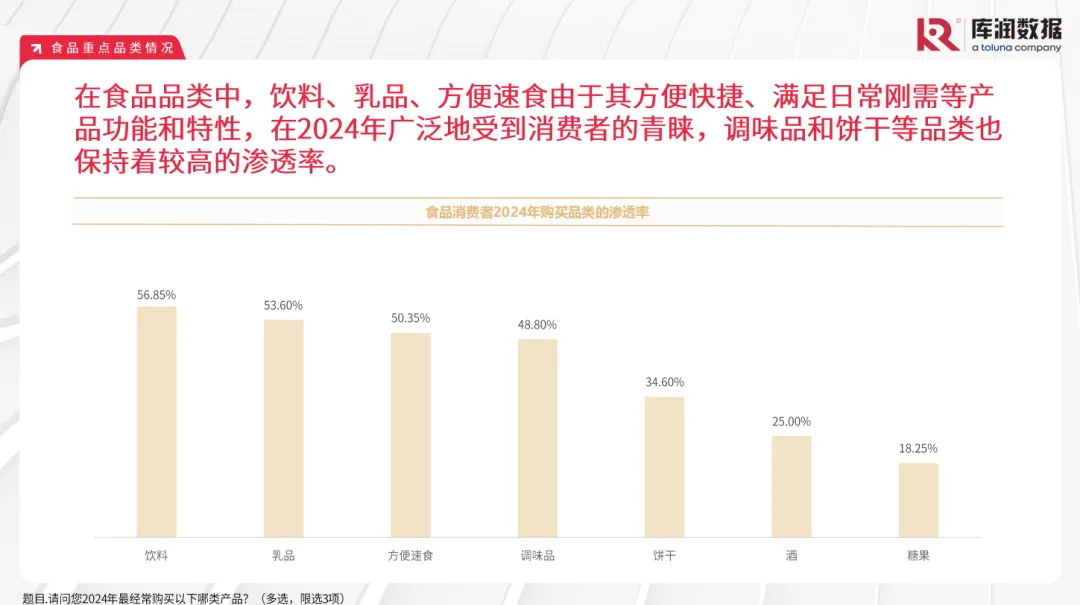 《2024年中国食品饮料行业消费者洞察》显示,饮料、乳品渗透率超 50%,女性、已婚有孩家庭为核心客群。报告重点分析健康化、即时性消费趋势,以及短视频 + 货架电商的种草转化路径。