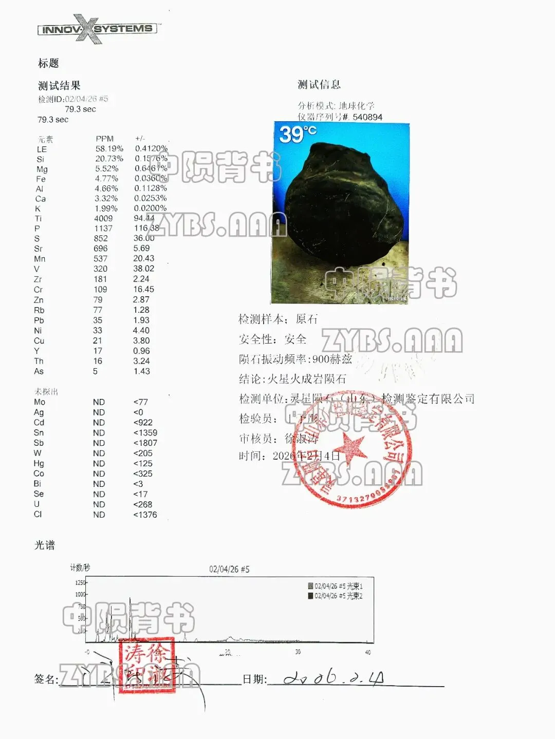 氧化锑(Sb₂O₃):1807ppm,属于火星火成岩陨石中较具代表性的微量元素,其含量与已知火星火成岩陨石的微量元素分布规律基本一致,进一步佐证其火星来源;