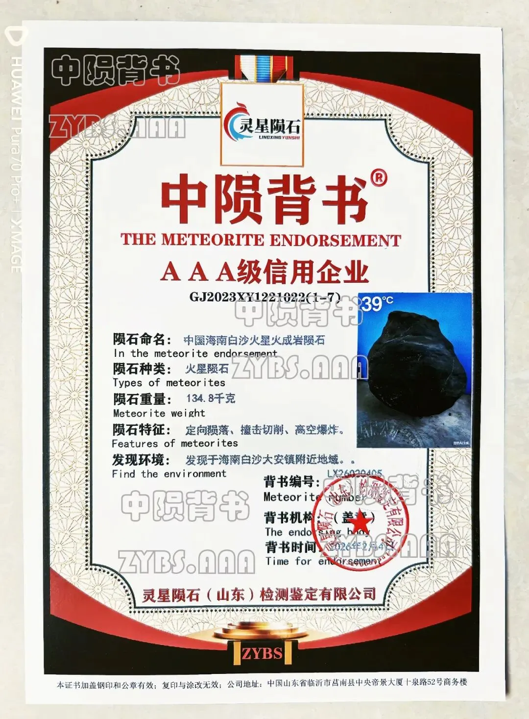 该海南白沙火星火成岩陨石重量136.8千克(136800克),体量远超上述苏富比拍卖陨石,且完整性、特征稀缺性(高空爆炸)、科研价值更具优势,同时具备独特的地域稀缺性,综合评估其市场价值:考虑到大型陨石总价并非简单按“单价×重量”计算(体量越大,单位重量价格略有降低,但总价增幅显著),结合其稀缺性、科研价值与市场行情,预计整体市场价值在2000万美元-3000万美元之间,具体价值可根据权威鉴定结果、市场需求、交易渠道进一步调整——若经过国际陨石学会(IMA)权威认证,其市场价值可提升至3000万美元以上,具备极高的收藏与投资潜力,与全球同级别大型火星火成岩陨石的市场价值基本持平。