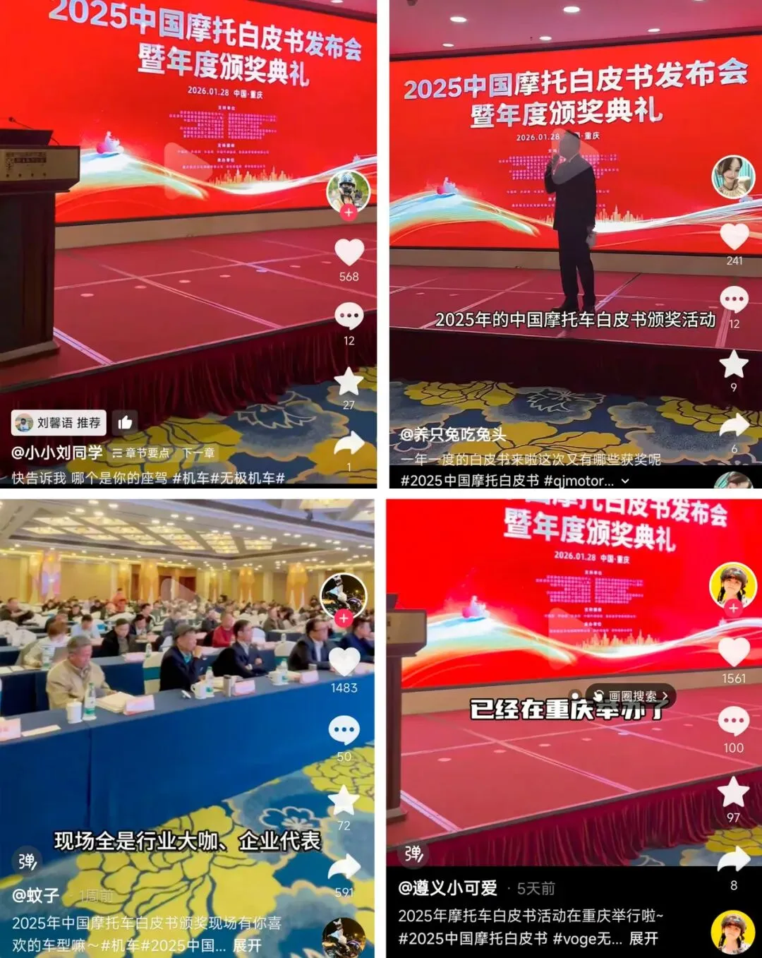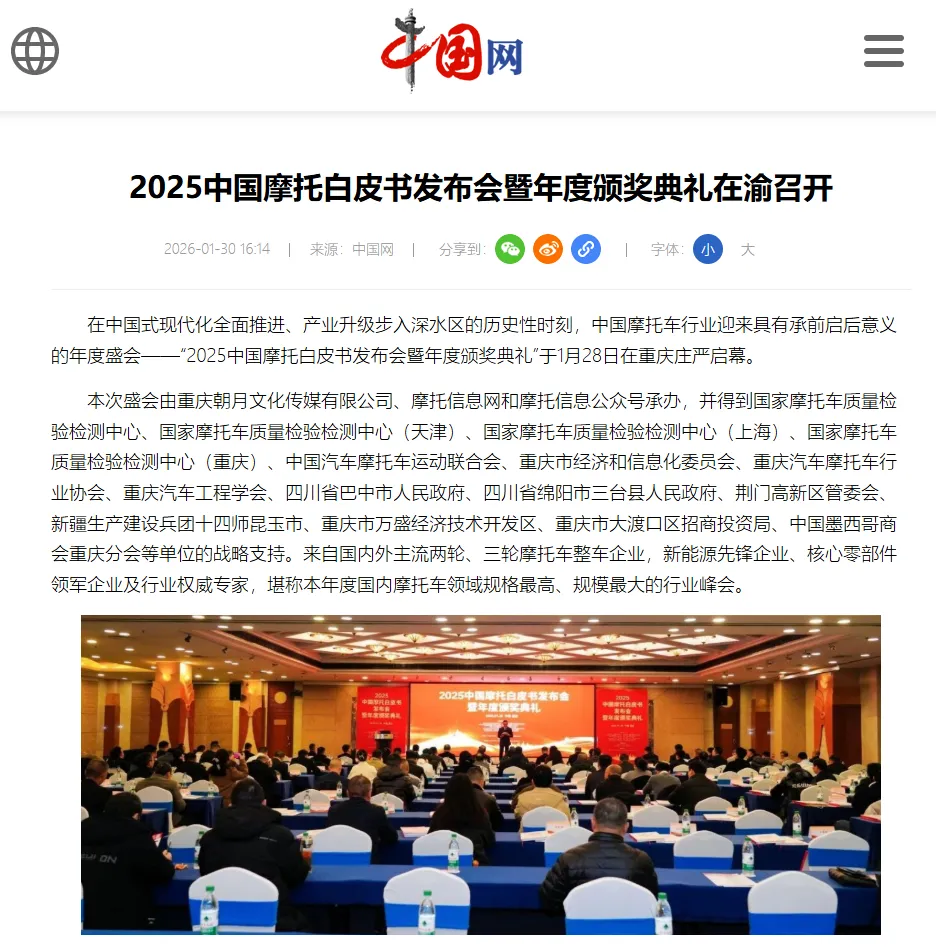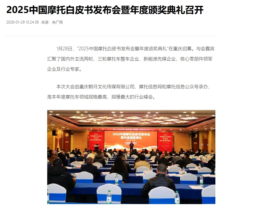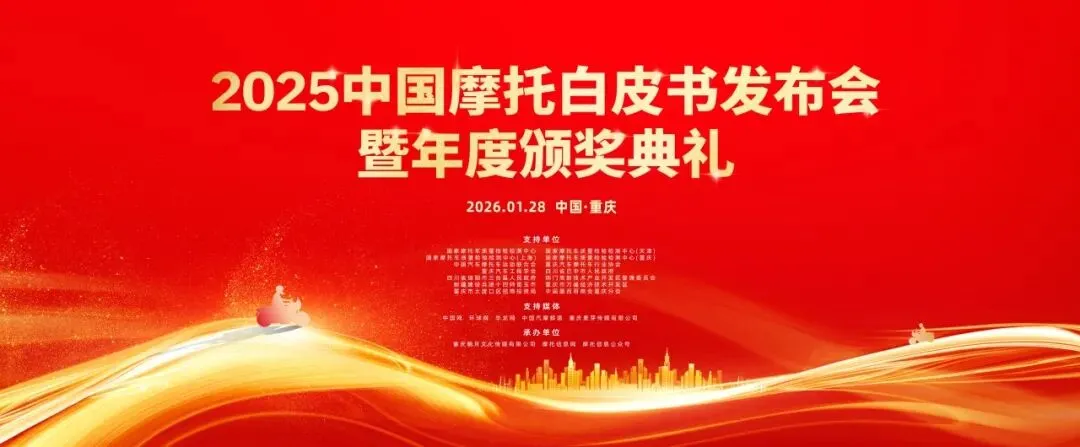 2025中国摩托白皮书发布会暨年度颁奖典礼于2026年1月28日圆满落幕。本次活动规格高、影响深,获得国家摩托车质量检验检测中心、国家摩托车质量检验检测中心(天津)、国家摩托车质量检验检测中心(上海)、国家摩托车质量检验检测中心(重庆)、中国汽车摩托车运动联合会、重庆汽摩协会等行业权威机构鼎力支持,同时获得重庆市经济和信息化委员会、四川省巴中市人民政府、荆门高新区管委会等多个地方政府部门的大力战略指导。