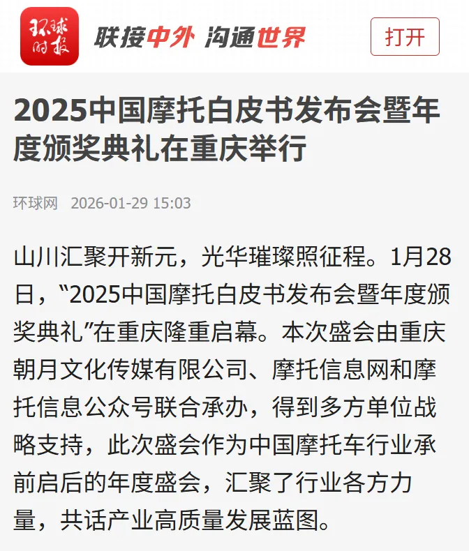 环球网转载了来自重庆的现场报道,向全球读者展示了中国摩托车产业的活力与创新形象。