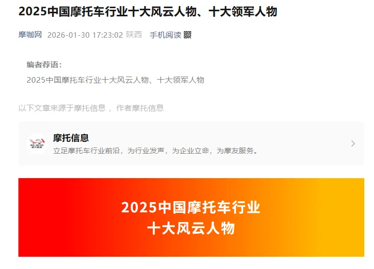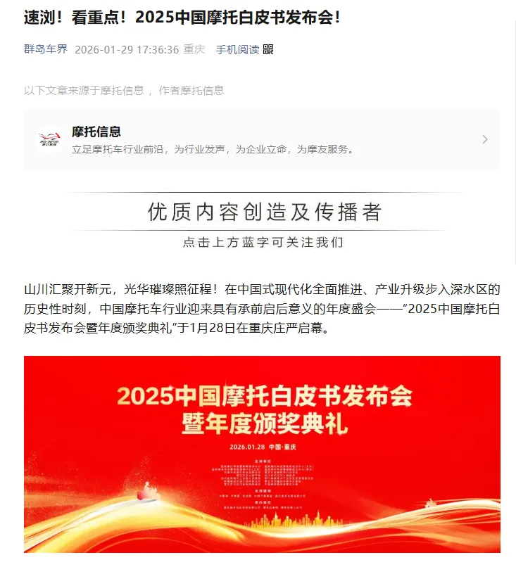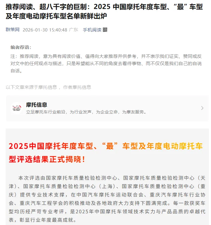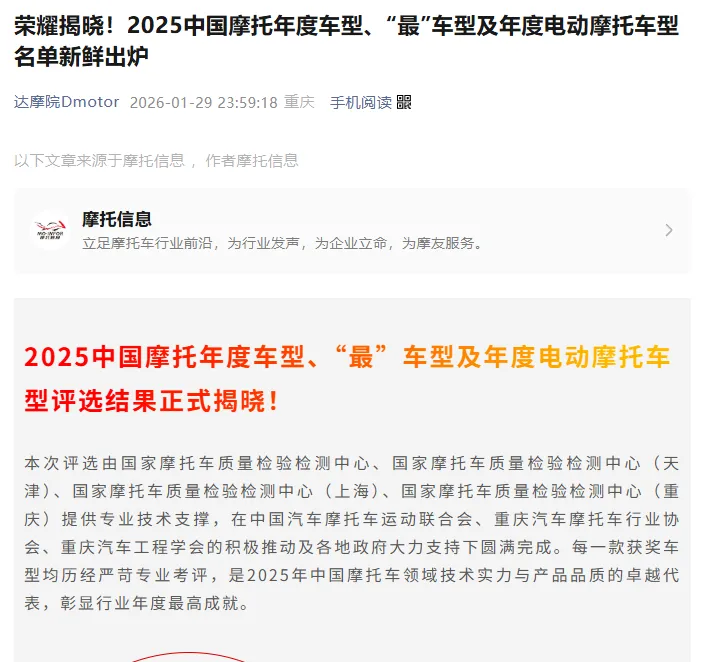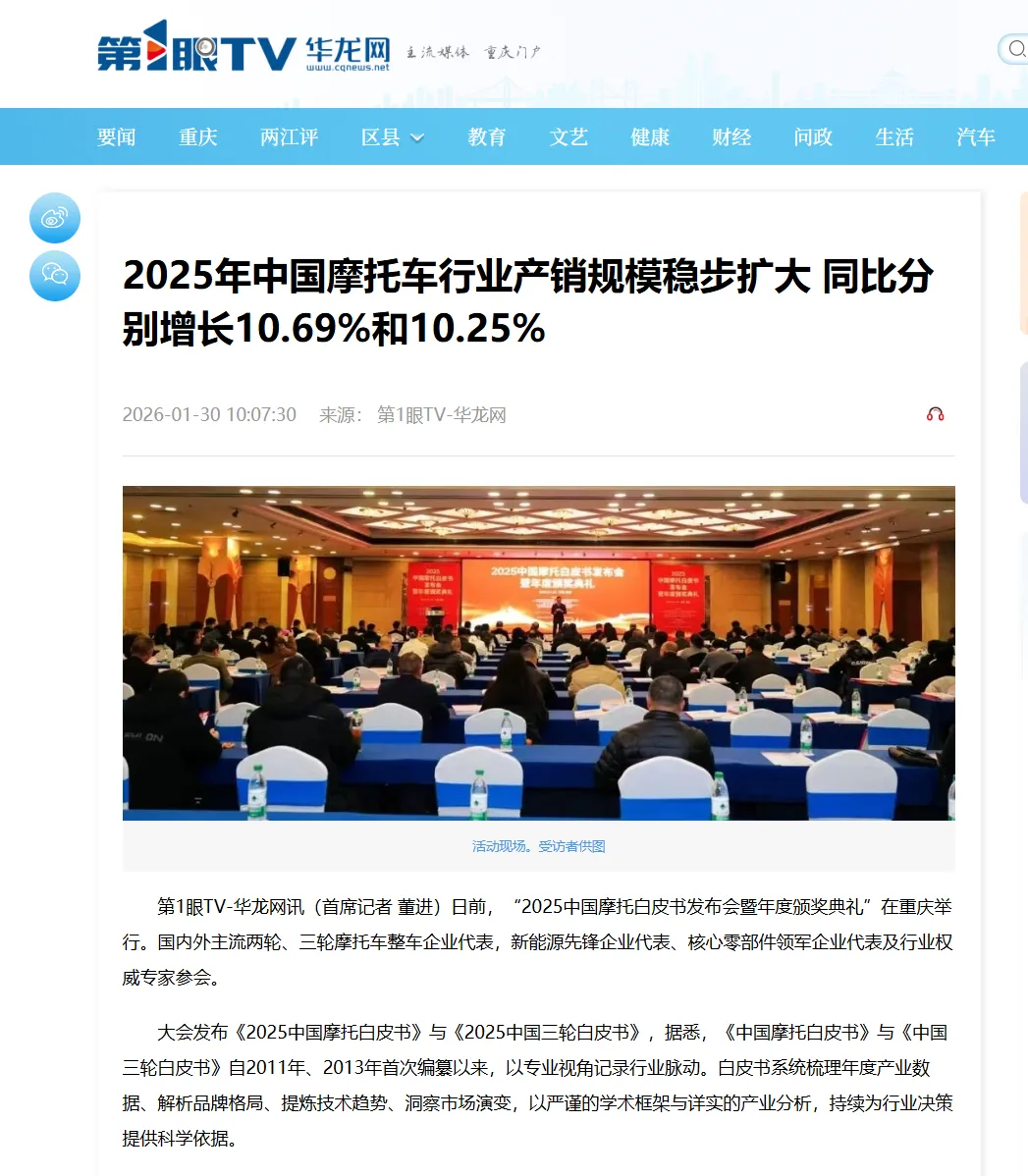 作为重庆本土权威媒体,华龙网深入报道了“重庆造”摩托车在年度评选中取得的亮眼成绩,彰显了其作为产业重镇的支柱地位。