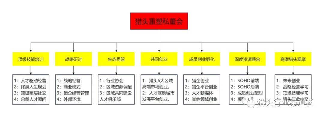 (3)私董会成员项目孵化:包括0-1创办猎头公司、0-1创办猎头服务平台(如给猎头公司、猎头顾问提供咨询培训服务)、0-1创办人才服务新媒体公司等。