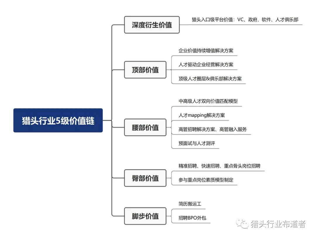 我们以深度价值为例,猎头行业的价值链条分为五级