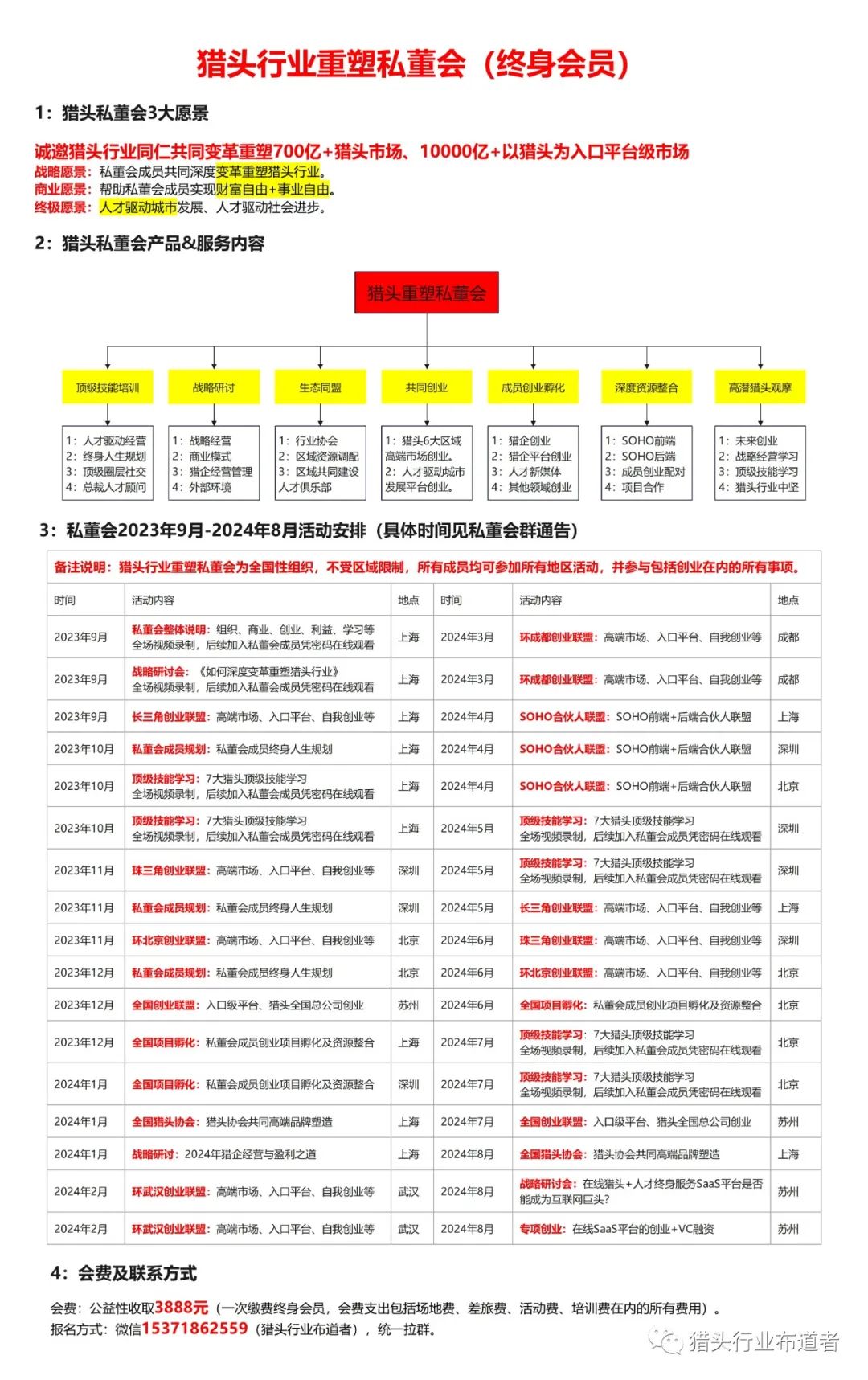 2:猎头行业私董会全年活动30-40场左右,包括共同创业(高端市场、猎头入口平台)、项目创业孵化、生态同盟、战略研讨、深度资源整合、猎头顶级技能、猎头人生规划。