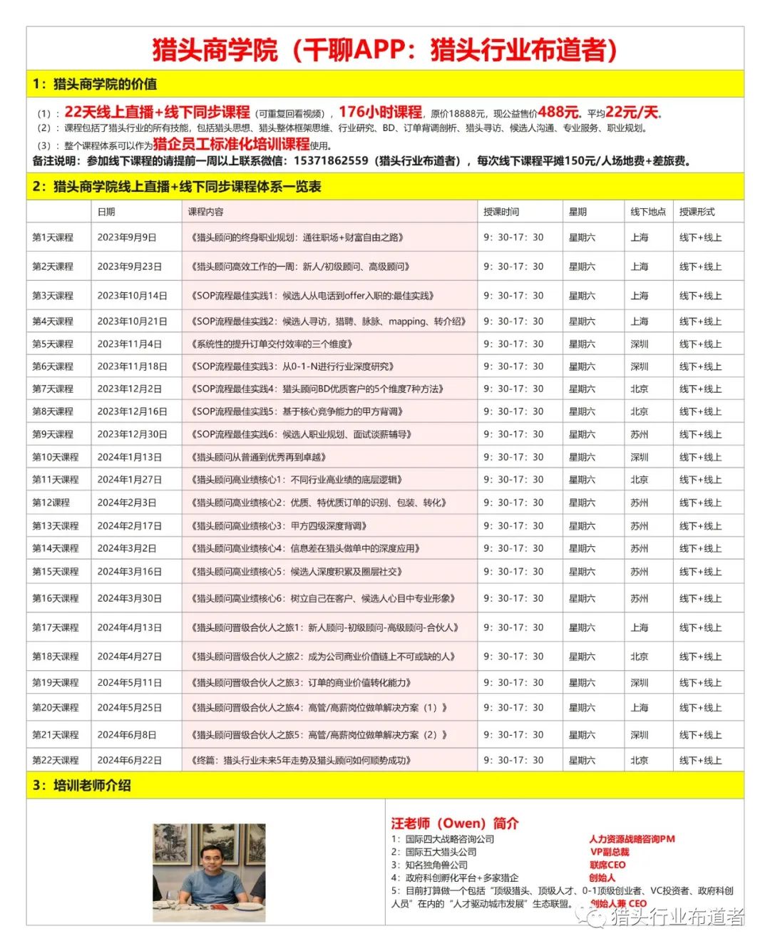 猎头商学院所有课程22天,176小时,线下培训+线上直播同步,所有课程原价18888元,猎头商学院公益性价格488元,平均每天8小时课程22元,唯一要求是3人团购(团长免费),尽可能的扩大影响,尽可能的通过猎头商学院为后续的猎头行业深度变革重塑提供具备较高技能的猎头顾问。