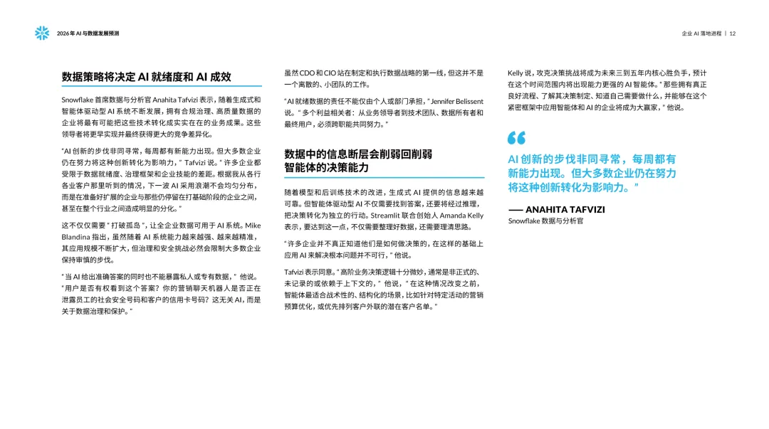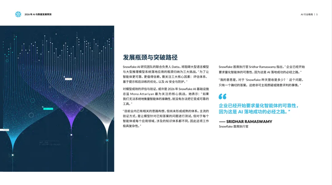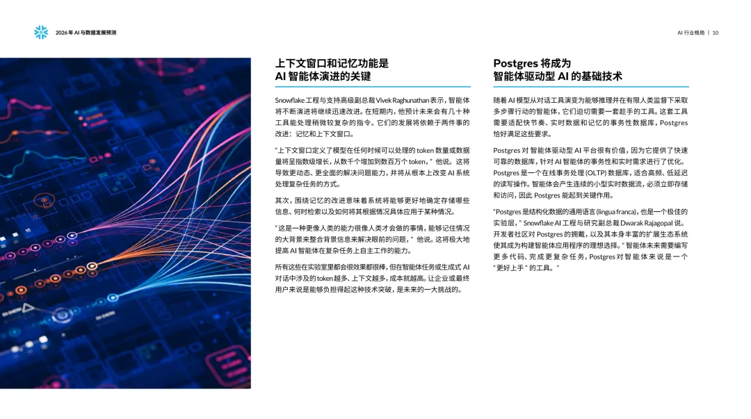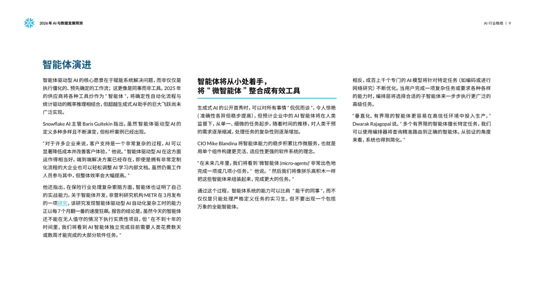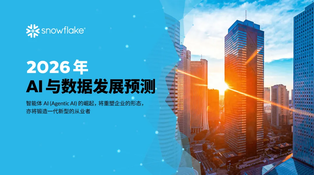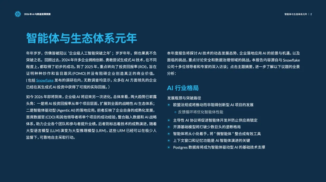 Snowflake发布的这份《2026年AI与数据发展预测》报告,以“智能体与生态体系元年”为主题,全面展望了人工智能技术在企业发展中的关键趋势。报告基于与Snowflake内部十多位专家的访谈,从行业格局、技术瓶颈、企业落地、职场变革到重点行业应用,层层递进地揭示了AI未来的演化路径。2026年被定位为智能体AI(Agentic AI)从概念走向实践的关键转折点,企业将不再孤立地追求单点AI项目回报,而是构建整合性的AI生态体系。公号后台回复“9”,在AI大模型·领地知识星球查看~......文│Snowflake