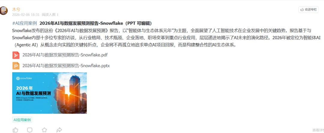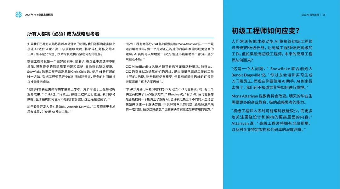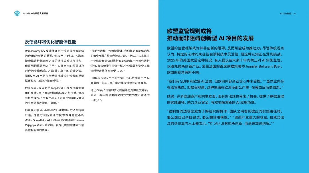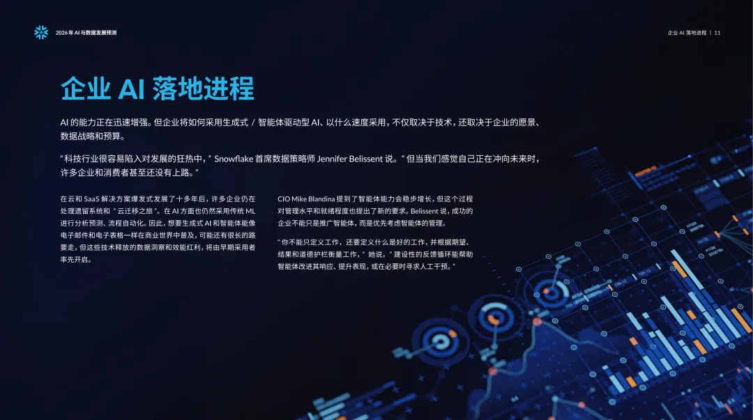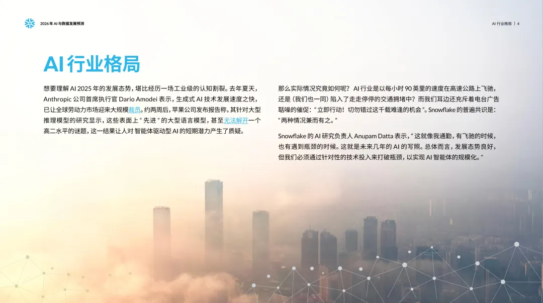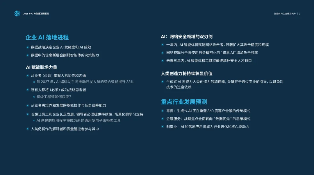 Snowflake发布的这份《2026年AI与数据发展预测》报告,以“智能体与生态体系元年”为主题,全面展望了人工智能技术在企业发展中的关键趋势。报告基于与Snowflake内部十多位专家的访谈,从行业格局、技术瓶颈、企业落地、职场变革到重点行业应用,层层递进地揭示了AI未来的演化路径。2026年被定位为智能体AI(Agentic AI)从概念走向实践的关键转折点,企业将不再孤立地追求单点AI项目回报,而是构建整合性的AI生态体系。公号后台回复“9”,在AI大模型·领地知识星球查看~......文│Snowflake