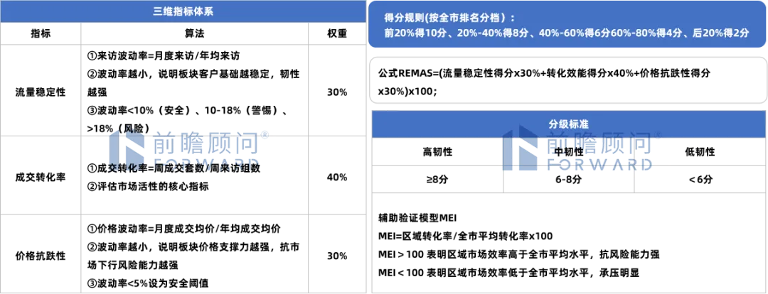 本研究核心创新在于:通过周度来访认购数据,构建“易获取、强量化、可落地”的简化版区域市场韧性评估指数(REMAS),替代传统单一指标分析,通过“流量-转化-价格”三维维度,精准评估不同板块的市场抗风险能力与成交潜力,为来访及成交预测提供核心支撑。
