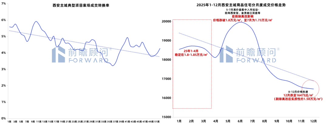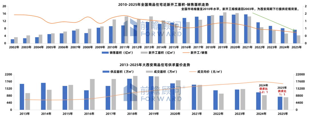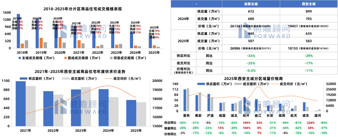 从“需求收缩”到“效能博弈”:2025年是西安楼市新旧模式转换的关键年,宏观内需不足致市场呈现高库存(17.7月)、慢去化(量缩17%)、弱价格(价跌6.2%)的被动局面。