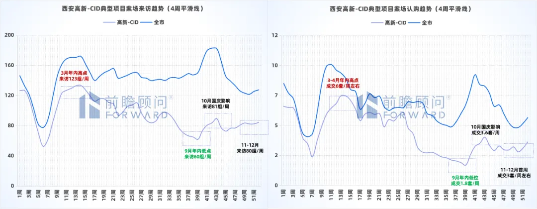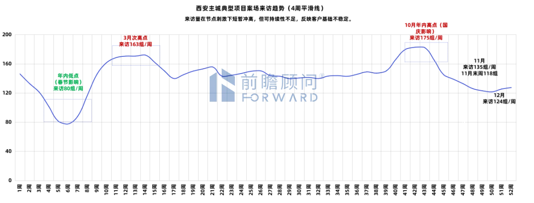 来访数据从全域见顶回落,且节点波动显著:3月次高点(163组/周),10月国庆冲高至175组/周,12月年底回落至124组/周,来访量峰值难以有效转化,反映市场缺乏内生增长动力。