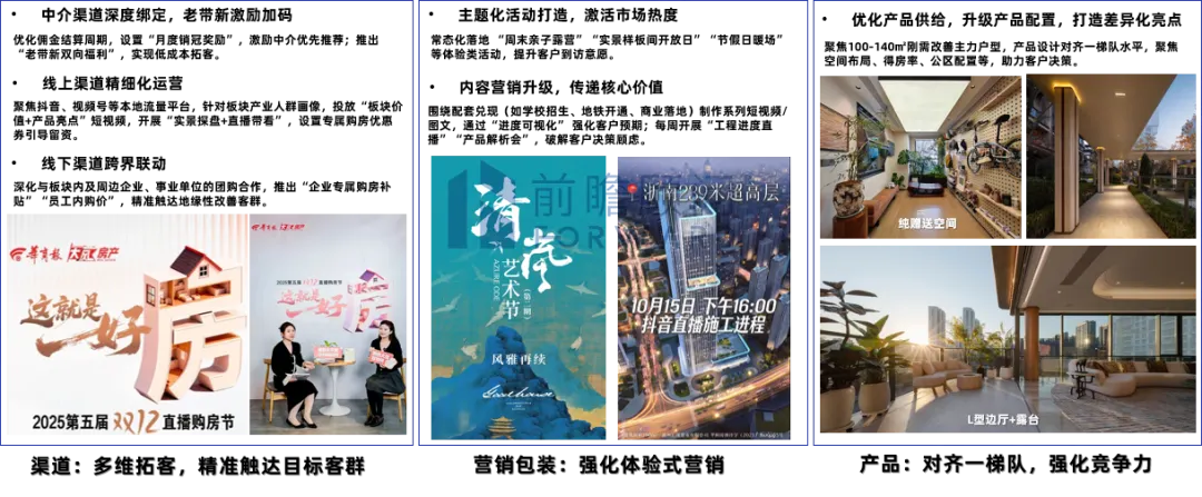 以高新软新/港务奥北为代表,房价基本面稳健态势,核心聚焦“流量+转化率”的双指标提升,通过渠道精准触达“流量问题”,体验式营销解决“认知问题”,产品升级解决“决策问题”,围绕让更多目标客群知道、愿意来看、看完愿意买”展开。