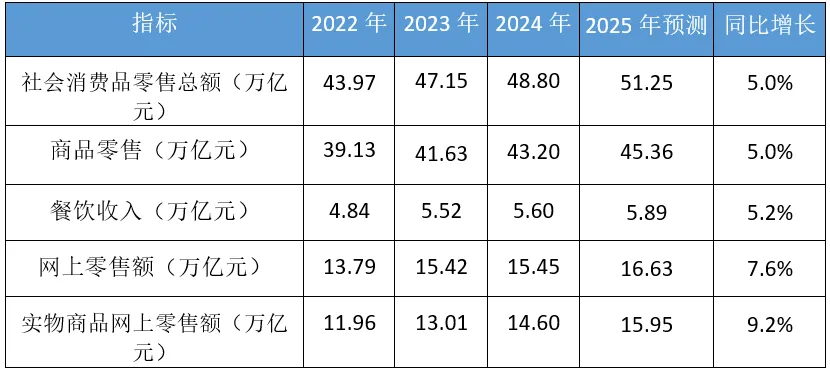2024年,我国社会消费品零售总额达到48.8万亿元,同比增长5.0%,消费市场规模持续扩大。其中,商品零售43.2万亿元,增长4.8%;餐饮收入5.6万亿元,增长6.5%。线上零售保持快速增长,实物商品网上零售额14.6万亿元,增长11.5%,占社会消费品零售总额比重达30.0%。
