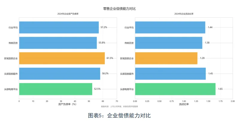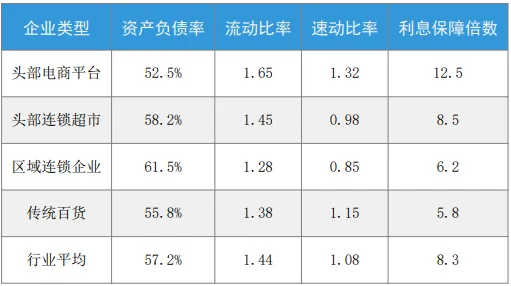 行业整体偿债能力良好,资产负债率控制合理。头部企业现金流充裕,短期偿债能力强。部分扩张型企业负债率较高,但在可控范围。传统零售企业去杠杆趋势明显。