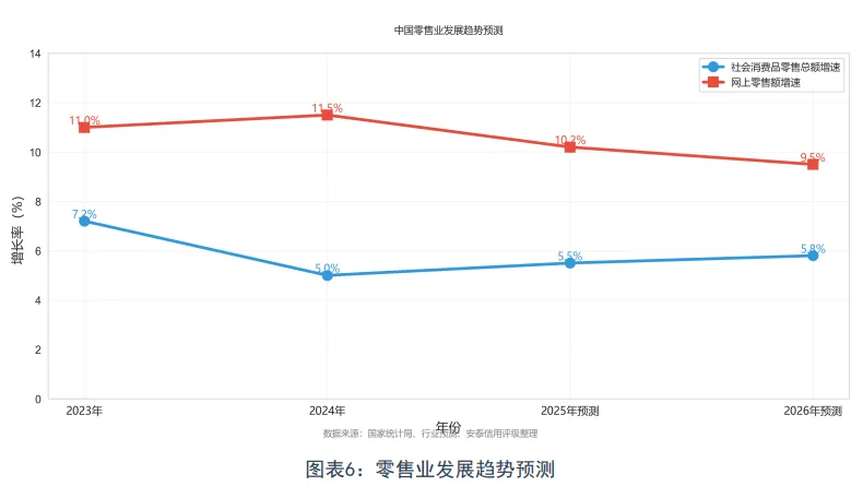 零售业将保持稳定增长态势。促消费政策持续发力,消费市场活力增强。线上零售保持较快增长,线下零售稳步恢复。头部企业竞争优势巩固,中小企业分化加剧。预计2026年社会消费品零售总额增速5-6%,行业整体信用质量保持稳定。