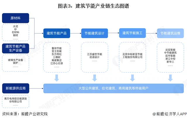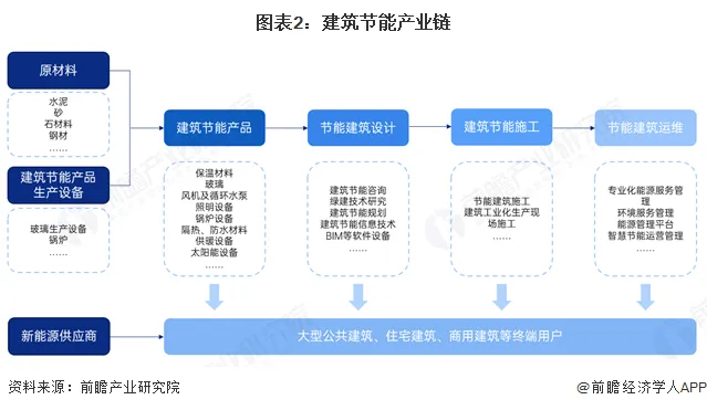 建筑节能行业的上游是建筑节能材料、设备制造行业。产业中游,建筑节能产品及材料中,外保温隔热材料主要有阻燃型EPS板、EPS板胶粘剂、EPS板抹面胶浆、网格布等;热计量和管网平衡设备主要有热计量表、平衡阀、温控器、数据采集箱等。大型设备主要包括中央空调、水泵、热泵、热交换器、燃气轮机等。此外,建筑键能产业链中游涉及设计、施工、运维服务提供商。建筑节能行业下游大多为大型公共建筑、住宅建筑、商用建筑等终端用户。
