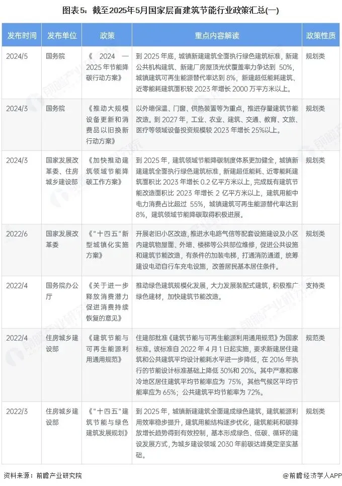 中国做出“双碳”承诺,碳排放力争于2030年前达到峰值,努力争取2060年前实现碳中和。在此背景下,我国建筑行业迈入“碳中和”时代,逐步向零能耗、零碳建筑发展。目前,政策均以“双碳”目标为核心,聚焦新建建筑节能标准提升、既有建筑改造、可再生能源应用等关键领域,旨在通过系统性措施降低建筑领域碳排放强度,推动城乡建设绿色转型。政策强调完善法规标准体系,例如加快修订《节约能源法》《民用建筑节能条例》,逐步将新建建筑节能标准提升至超低能耗水平,强化资金支持,包括中央财政补贴、绿色金融产品创新,以及对超低能耗建筑、既有建筑改造项目的专项奖励。截至2025年5月,国家层面的建筑节能相关政策/规划汇总如下: