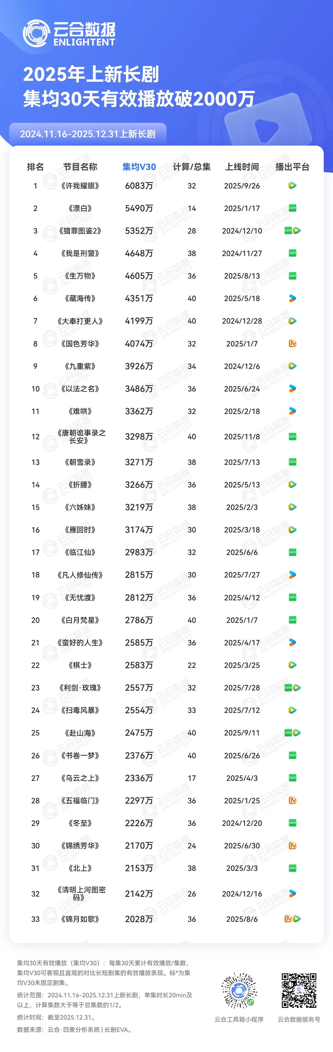 头部 2025年上新长剧霸屏榜TOP20正片有效播放296亿,同比缩减20%。41部长剧云合评级为S+。