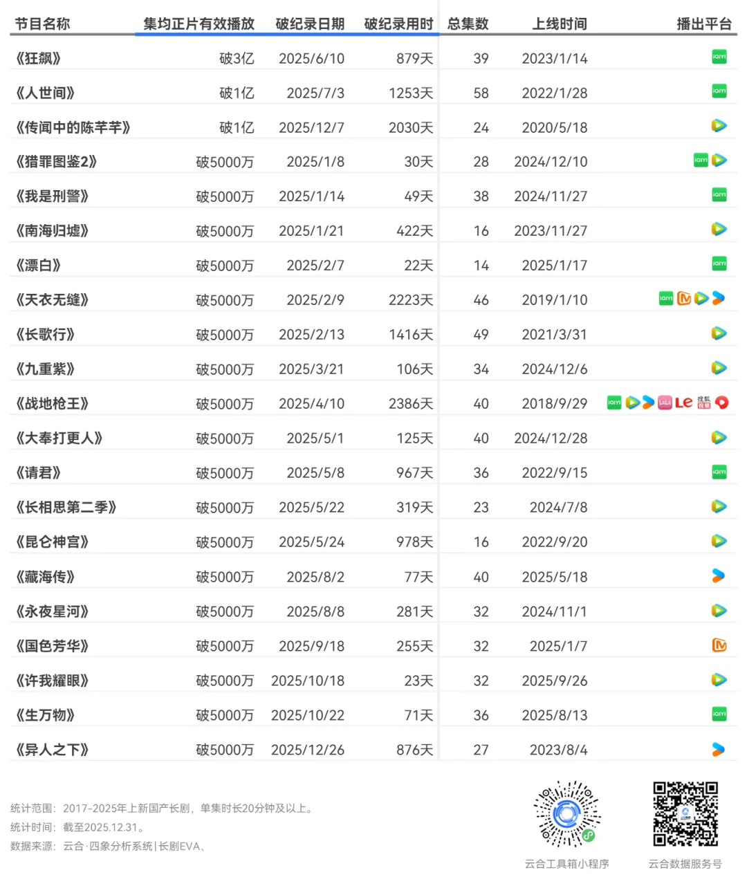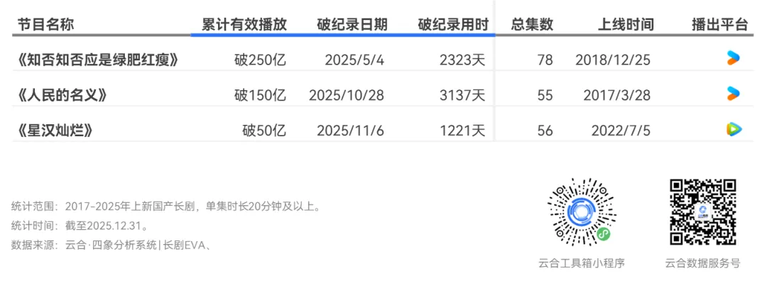 截至2025年12月31日,共有258部国产长剧进入有效播放俱乐部,以下为破纪录时间在2025年的作品: