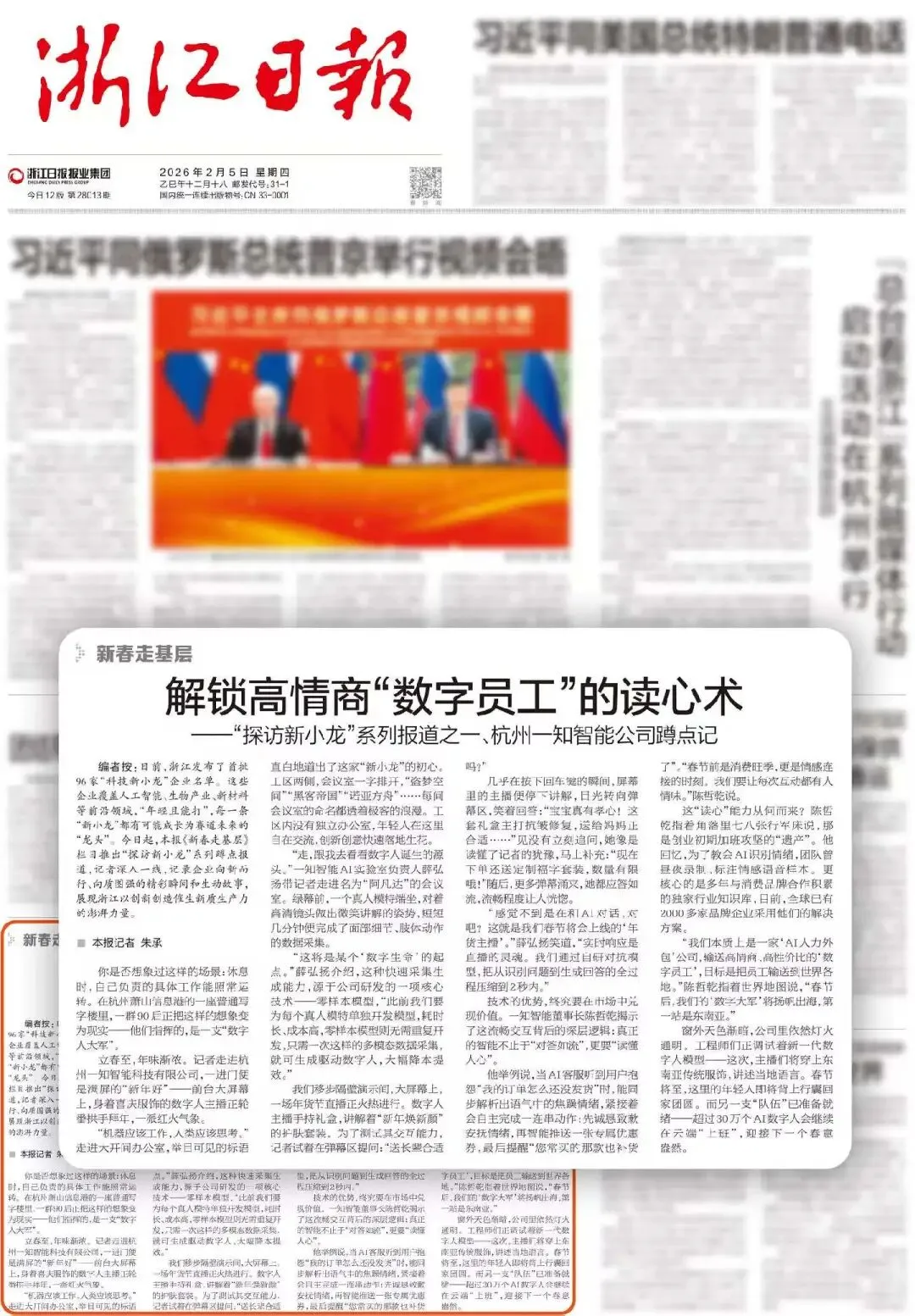 2月5日,浙江日报头版以《“探访新小龙”系列报道① 杭州一知智能公司蹲点记:解锁高情商“数字员工”的读心术》为题,对信息港企业一知智能进行了深度报道,以下是报道全文: