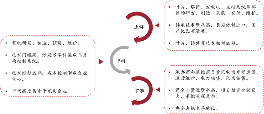 我国的风电产业已形成从上游零部件制造到下游电站运营的完整产业链;上游主要包括核心零部件制造,如叶片、塔筒、发电机、主控系统等;中游为整机制造与集成;下游则为风电场的投资、建设与运维。