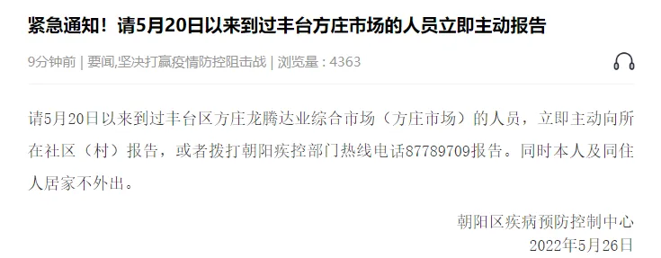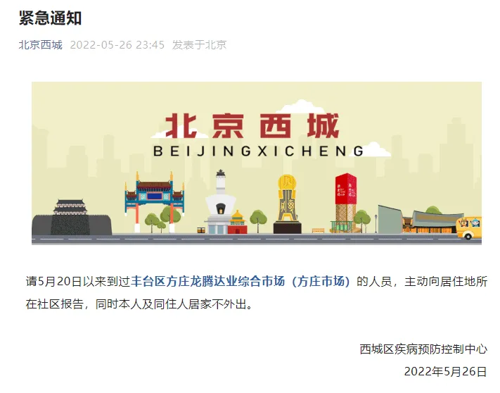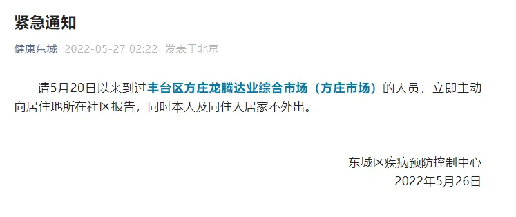 5月26日深夜至27日凌晨,北京西城、朝阳、丰台、东城分别发布“紧急通知”:要求5月20日以来到过丰台区方庄龙腾达业综合市场(方庄市场)的人员,主动向居住地所在社区报告,同时本人及同住人居家不外出。