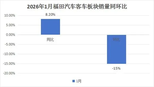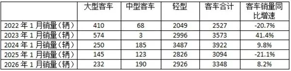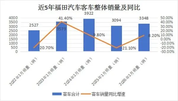 根据福田汽车产销数据,2026年1月其客车销量3348辆,同比2025年1月的3094辆增长8.2%,环比上月的3942辆下降15%。