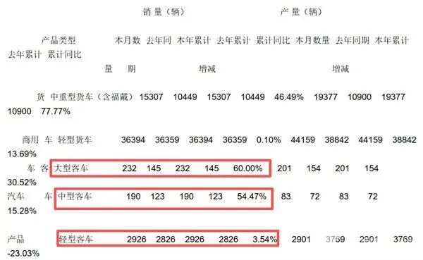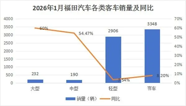 2026年累计销量中,福田汽车客车板块销量为3348辆,同比增长8.2%。其中,大型客车销量232辆,同比增60%;中型客车销量190辆,同比增54.47%;轻型客车销量2926辆,同比增3.54%。