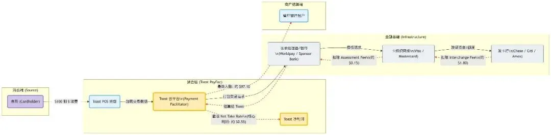Toast 在支付链条中扮演 Payment Facilitator (PayFac) 的角色。它屏蔽了底层的 ISO 和网关,直接对商户拥有定价权。
