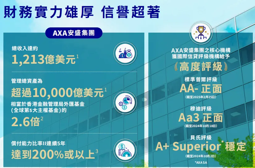 AXA安盛的财务稳健性表现突出,偿付能力充足率达216%,远超欧盟规定的100%最低标准,凭借扎实的财务实力,赢得了多家国际权威评级机构的高度认可——标普评级为AA-、穆迪评级为Aa3、贝氏评比为A+Superior,其中标普与穆迪均上调其评级展望至积极,充分彰显了全球市场对其发展前景的信心。