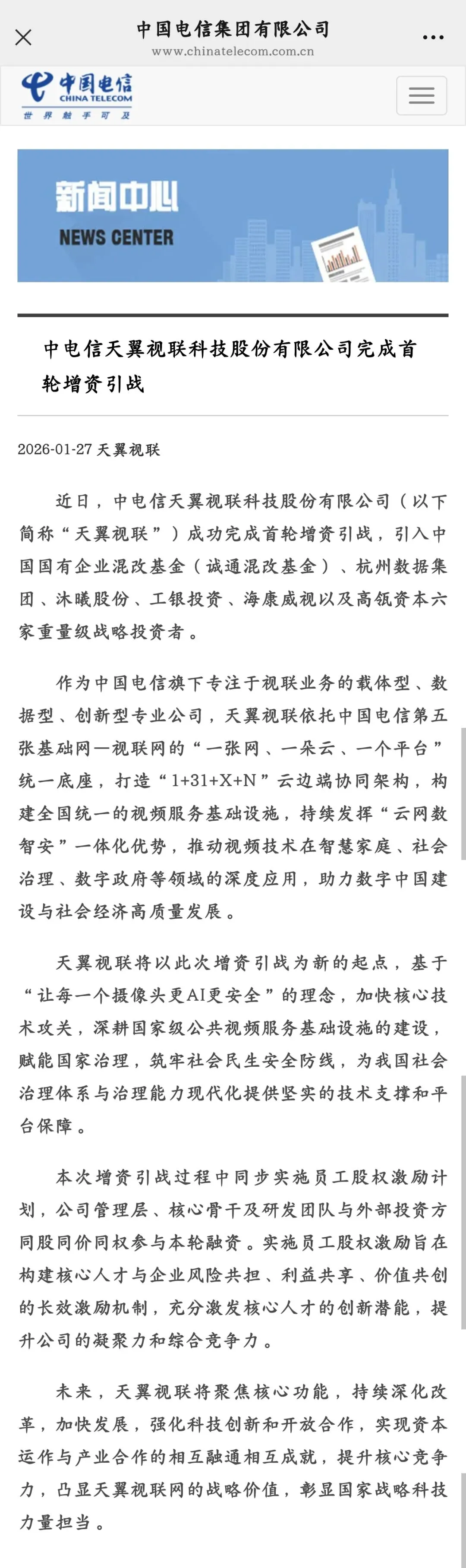 1月27日,中国电信集团公司官网发布消息称,中电信天翼视联科技股份有限公司(以下简称“天翼视联”)成功完成首轮增资引战,引入中国国有企业混改基金(诚通混改基金)、杭州数据集团、沐曦股份、工银投资、海康威视以及高瓴资本六家重量级战略投资者。