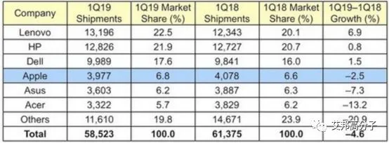 如下是调研机构Gartner发布的2019年第一季度全球PC出货量排名,可以得出如下结论: