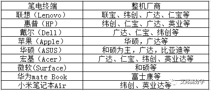 如下为主流笔电终端对应的整机厂商,从下可以看出笔电代工主要由台系广达、仁宝、纬创、和硕、英业达掌控,前5大厂商大约占笔电出货总量85%以上。