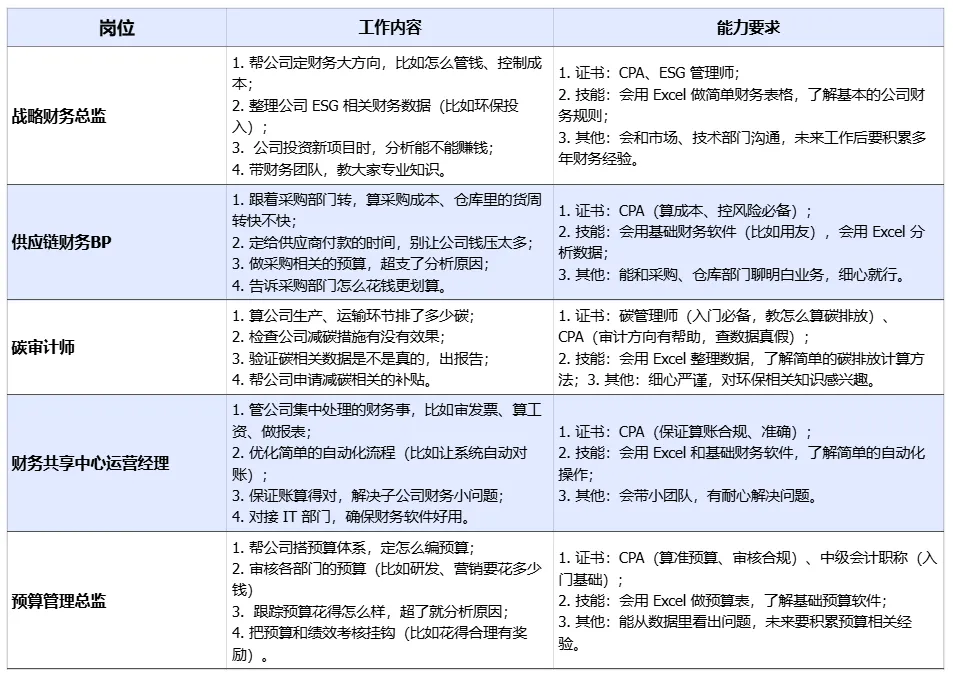 技术前沿:早就告别低效记账,现在流行财务共享中心(自动化效率是人工20倍)、财务BP(70%精力做数据分析)、碳审计师(年增速40%)、ESG财务岗,全是高价值、有技术含量的岗位。