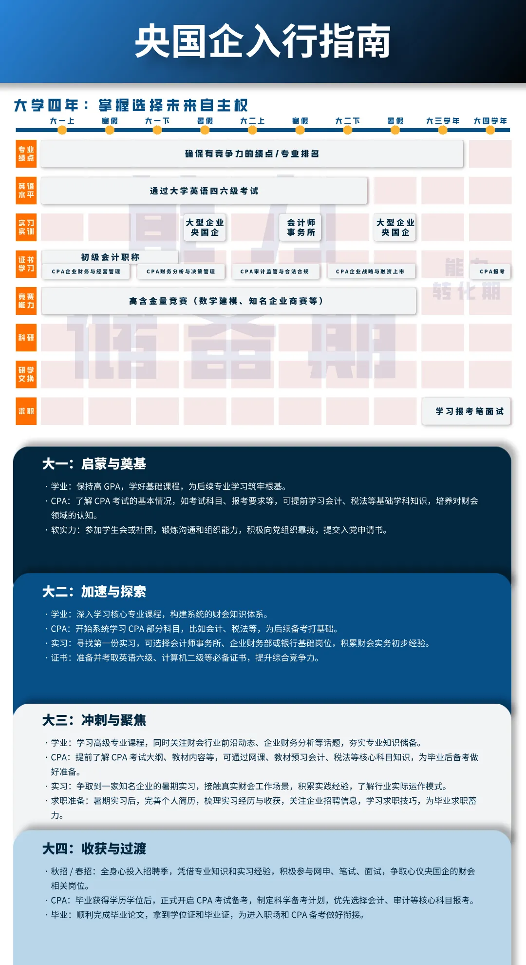系统学习《审计学》、《高级财务会计》等CPA核心科目,争取高分。积极申请会计师事务所的央企审计项目实习,亲身感受CPA知识在实际工作中的应用。