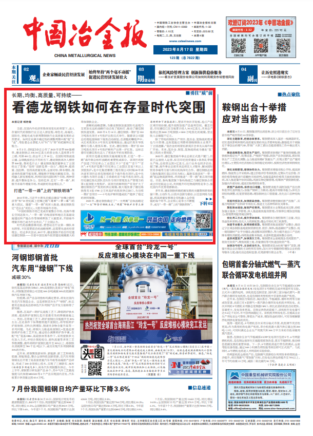 8月2日,《财富》杂志公布了2023年世界500强榜单,德龙钢铁以335.34亿美元的营业收入连续第2年上榜,列第451位,较去年上升18位。在国际局势波诡云谲、全球挑战层出不穷的当下,德龙钢铁再次入榜世界500强,靠的是什么?德龙钢铁集团董事长丁立国给出了答案:“坚持‘创新是第一动力’,增品种、提质量、创品牌。坚持高质量发展,全面对标、降本增效,推进绿色低碳节能发展,增强数字智能化赋能实效。坚持融入新发展格局,利用好国内国际两个市场、两种资源,提升整体竞争力。坚持走深、走实‘一带一路’,积极寻求海外增量市场,形成新的效益增长点。”