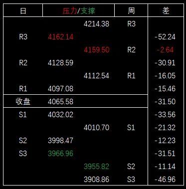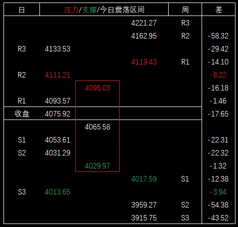 大盘最低4029.97,毗邻支撑区间,比日第二支撑位4031.29低1.32,比支撑区间上沿(周第一支撑位)4017.59高12.38。
