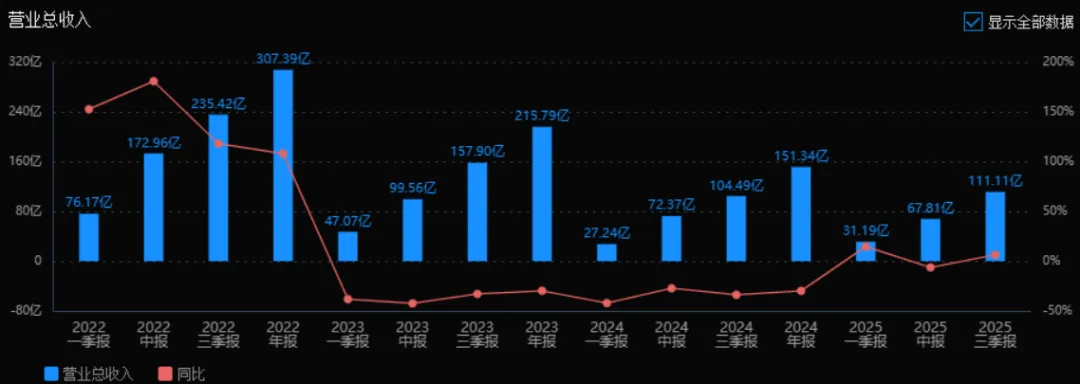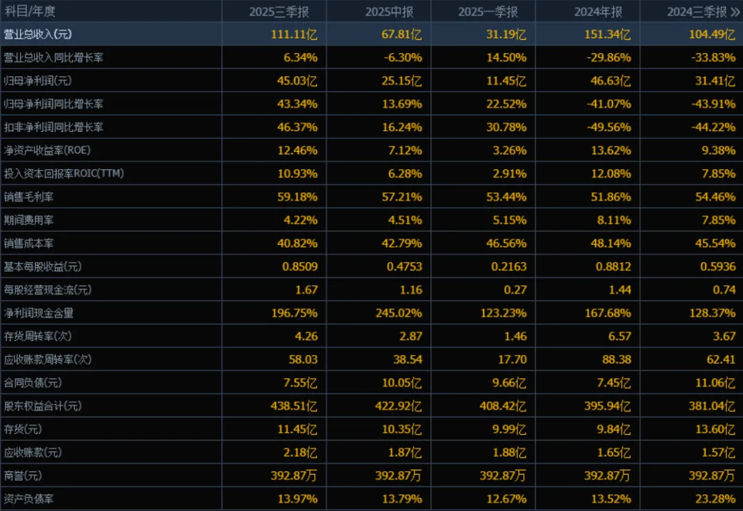 2025年三季度的营业总收入为111.11亿元,相较于2024年三季度的104.49亿元,增长了6.34%。评价: 收入在经历2024年三季度的显著下滑后,2025年三季度已恢复正增长,显示公司业务逐步复苏。
