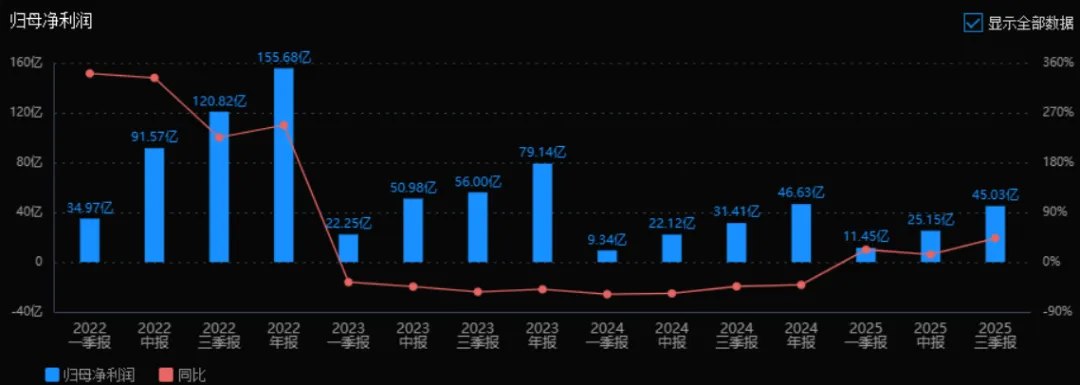 2025年三季度的归母净利润为45.03亿元,相较于2024年三季度的31.41亿元,增长了43.34%。评价: 净利润增长显著高于收入增长,表明公司在成本控制或盈利能力方面有明显改善。