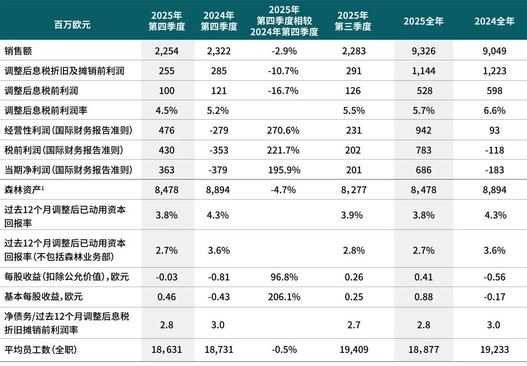 2025年完成的瑞典17.5万公顷森林资产剥离,将导致年度经营性息税前利润减少约2000万欧元,对每季度造成的影响预计约为500万欧元。