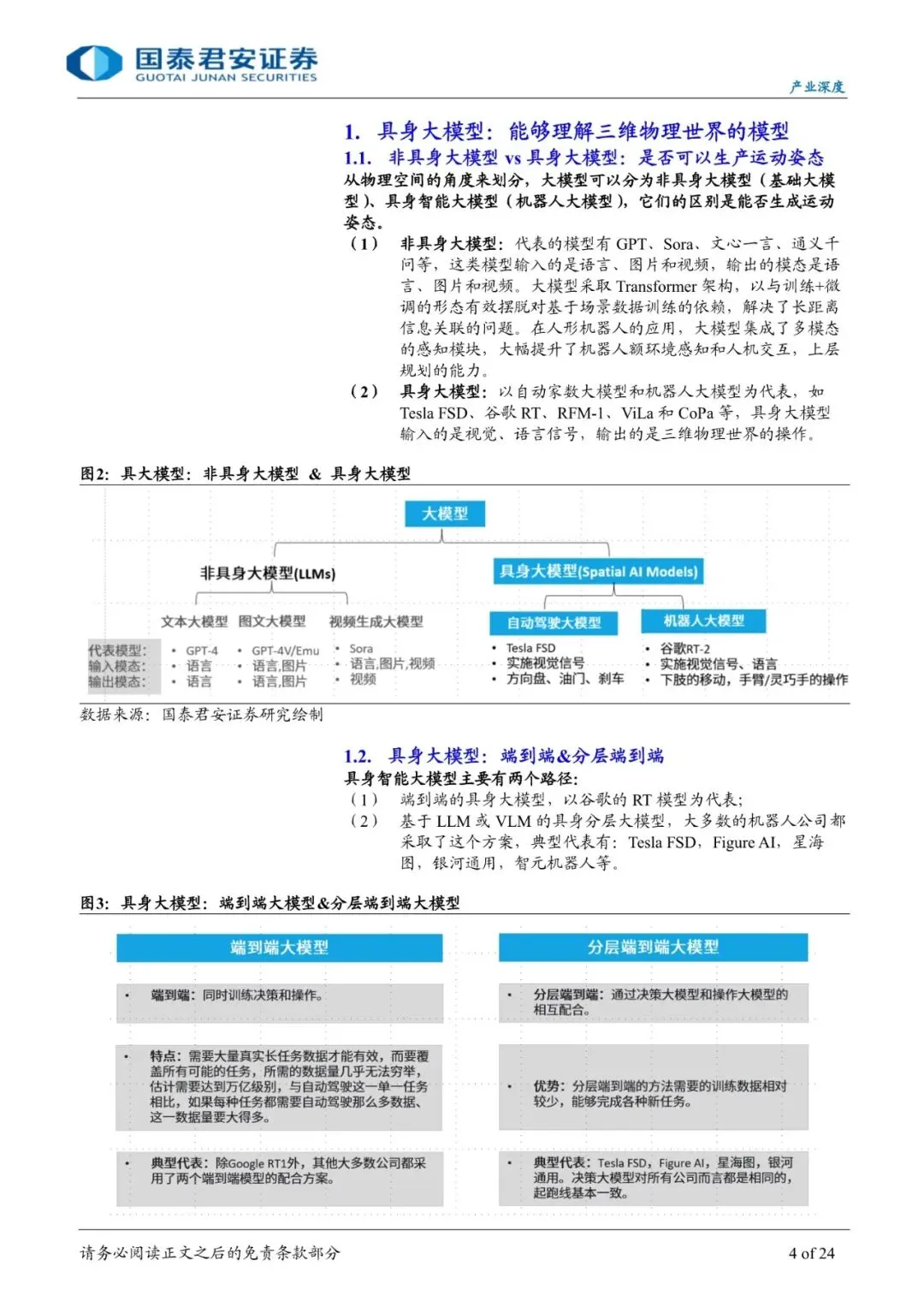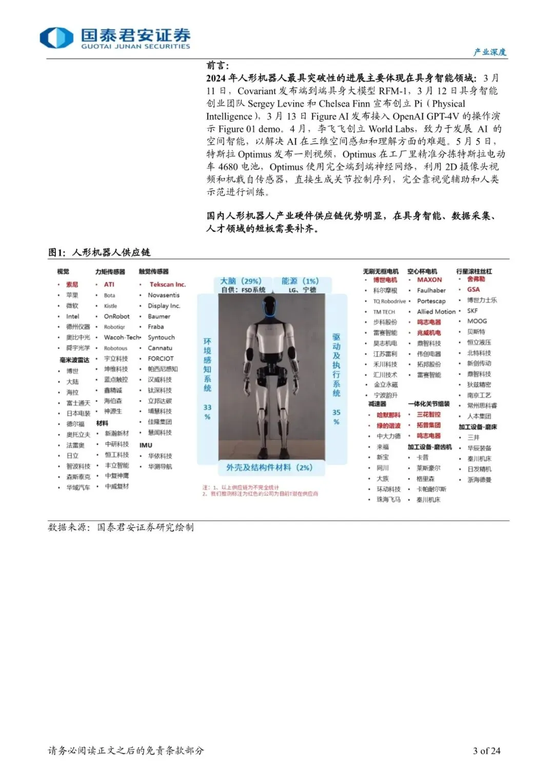 2024年人形机器人最具突破性的进展主要体现在具身智能领域: 3月11日, Covariant发布端到端具身大模型RFM-1,3月12日具身智能创业团队Sergey Levine和Chelsea Finn宣布创立Pi Physical Intelligence,3月13日Figure AI发布接入OpenAI GPT-4V的操作演示Figure 01 demo。 4月,李飞飞创立World Labs,致力于发展AI的空间智能,以解决AI在三维空间感知和理解方面的难题。5月 5日,特斯拉Optimu发布一则视频,Optimus在工厂里精准分拣特斯拉电动车4680电池,Optimus使用完全端到端神经网络,利用2D摄像头视频和机载自传感器,直接生成关节控制序列,完全靠视觉辅助和人类示范进行训练。