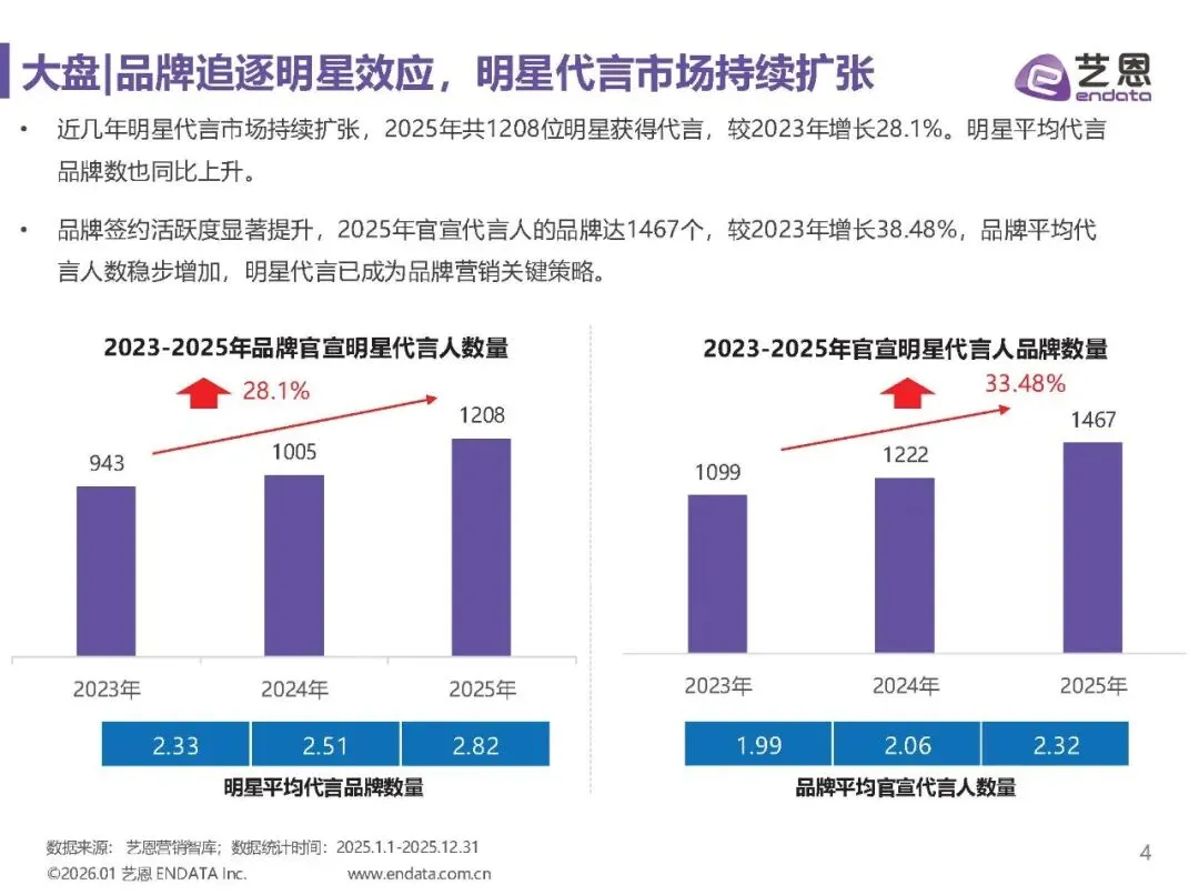 2025年明星代言市场持续扩张,品牌官宣明星代言人数量达1208位,同比增长28.1%,品牌签约活跃度显著提升,明星代言成为品牌营销关键策略。