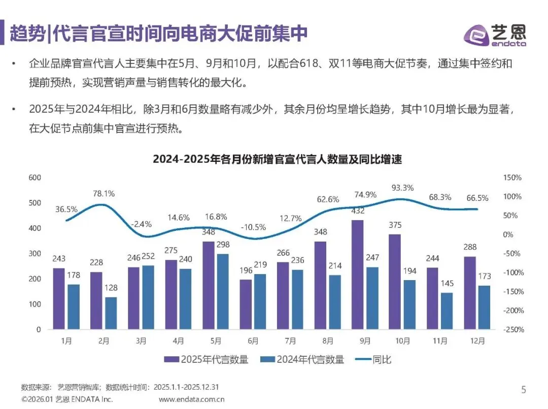 代言官宣时间集中于电商大促前,如5月、9月和10月,以最大化营销声量与销售转化。